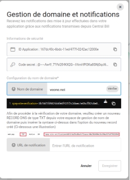 CentralBill fournit des clés d’authentification sécurisées pour chaque application utilisez la molette de parametre disponible sous “Gestion des domaines et notification” . Recopiez ces clés et assurez-vous de les intégrer correctement dans le code de l’application pour garantir une communication sécurisée.