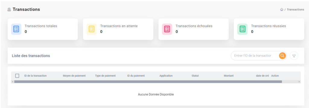 La page principale de la section « Transactions » affiche une vue d’ensemble des transactions récentes avec des détails tels que la date, le montant, le statut, et la référence.